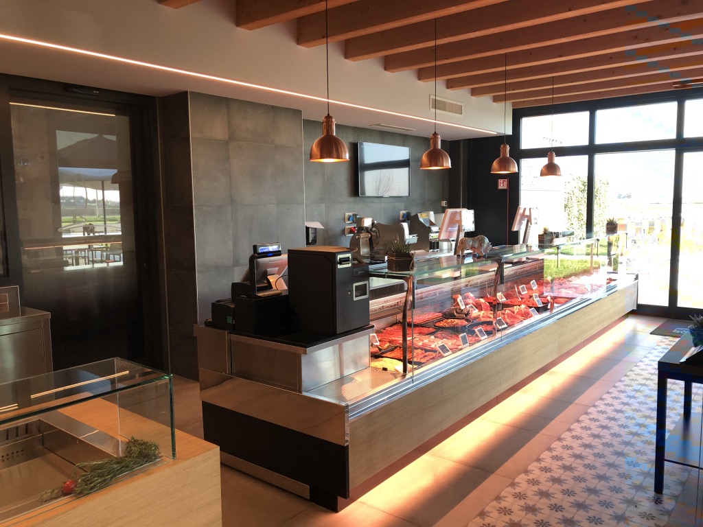 In questo locale, realizzato sul progetto dello Studio di architettura Azzali, abbiamo voluto valorizzare al massimo la parte espositiva, creando delle ampie vetrine che danno al cliente la possibilità di assaporare con gli occhi la carne che poi andrà a scegliere.